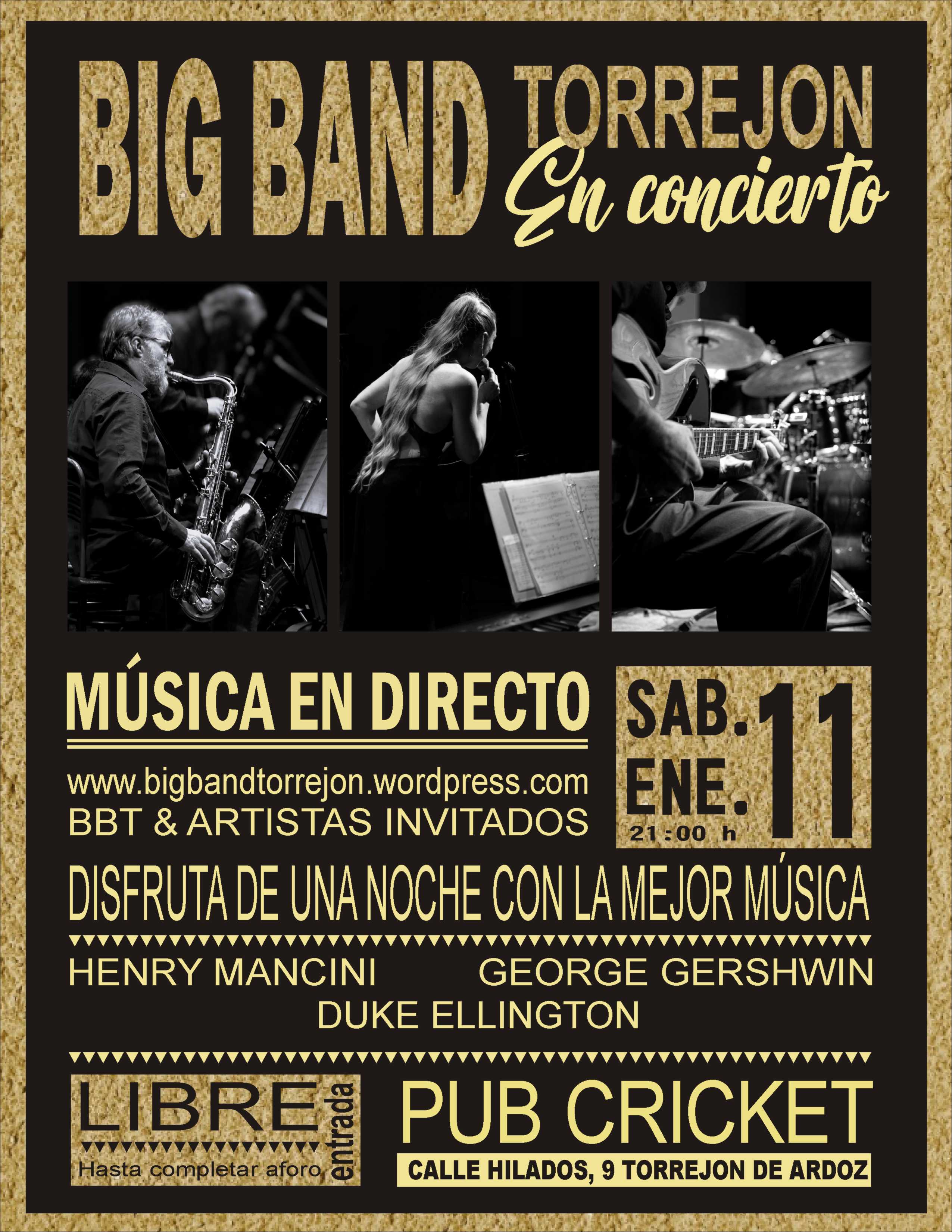¡Celebramos el nuevo año con música! El próximo sábado 11 de enero del 2025 a las 21:00 horas, el Pub Cricket se llenara de ritmo y buenas vibraciones con el concierto de la Big Band Torrejón.