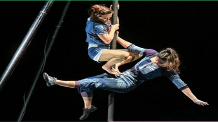 Nüshu es un taller de costura transgresor protagonizado por centenares de tejanos, un mástil, una máquina de coser, una escalera, bobinas de hilo, una cuerda lisa y cinco mujeres. Acróbatas que trabajan, cosen, bailan, ríen y trepan.