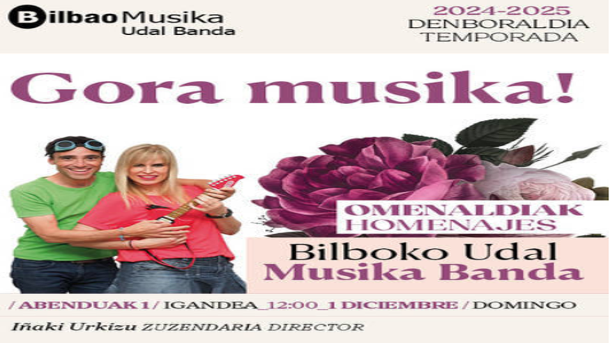 El nuevo grupo "Gora musika" llega a Euskalduna junto a la Banda Municipal de Bilbao para dar un concierto muy especial dirigido al público infantil. Los anteriormente conocidos como Eneko y Nerea de Ene Kantak, nos traen canciones conocidas por todos y todas como "Ausartak", "Polonesa", "Alemana", "Pérez sagutxoa" y también temas nuevos con los que disfrutaremos de lo lindo. Todo ello amenizado por un cuento, entre canción y canción, que nos hará reír y pensar. También habrá varias sorpresas que no te puedes perder. Ven a bailar y a disfrutar de la fiesta.