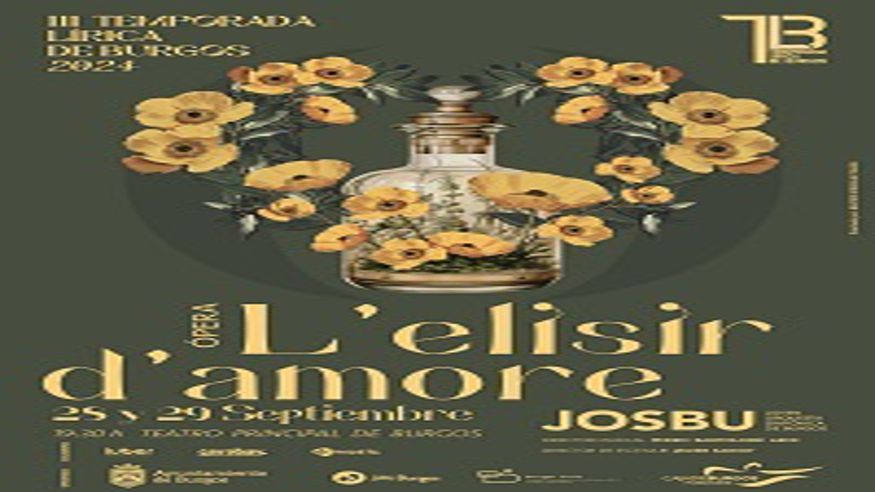 Sábado 28 y domingo 29 de septiembre de 2024. 19:30 h. III TEMPORADA LÍRICA DE BURGOS. ÓPERA. "L'elisir d'amore" (Música: Gaetano Donizetti. Libreto en italiano: Felice Romani). Joven Orquesta Sinfónica de Burgos. Coro de la Temporada Lírica de Burgos (director Juan Gabriel Martínez Martín). Dirección de escena: Francisco Javier Sariot Marquina. Dirección musical: Pedro Bartolomé Arce. Adina: Laia Vallés (soprano). Nemorino: Jesús Álvarez (tenor). Dulcamara: Jorge Tello (bajo). Belcore: Pablo Gálvez (barítono). Giannetta: Almudena Martínez (soprano). Teatro Principal de Burgos. Zona A: 30 €, Zona B: 24 €, Zona C: 15 €, Zona D: 12 € (+ comisión de venta por internet). Programación conjunta Fundación Caja de Burgos y Ayuntamiento de Burgos.