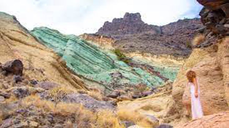 Empezaremos a caminar por un paraje semidesértico admirando los vivos colores verdosos y rojizos del monumento natural de los Azulejos de Veneguera. Veremos cómo las montañas parecen haber sido decoradas por delicadas pinceladas y os contaremos cómo se creó este paisaje tras las erupciones del volcán de Tejeda.